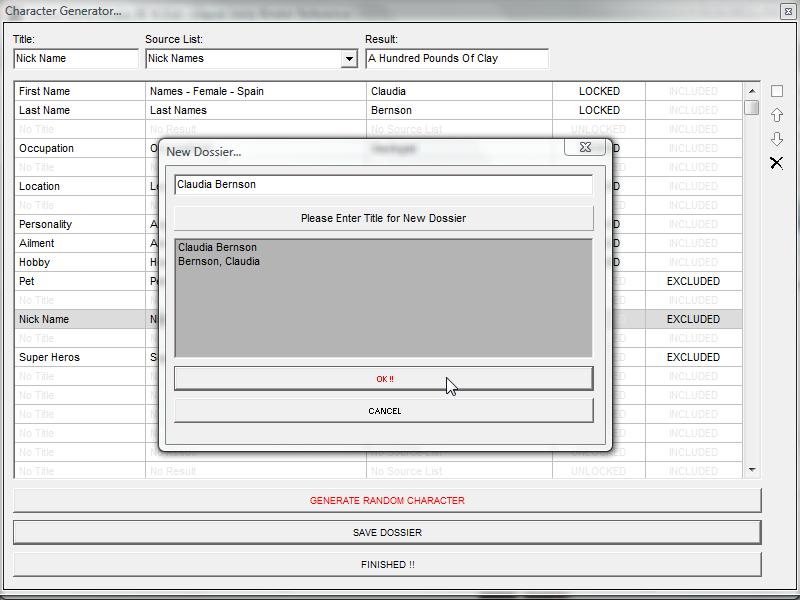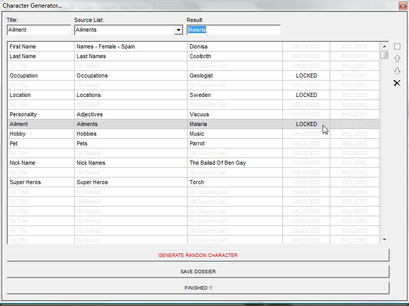 The �Character Generator� allows users to quickly create random character dossiers using an almost unlimited number of fields. Incorporate your own unique item titles, sorting them into any desired order.