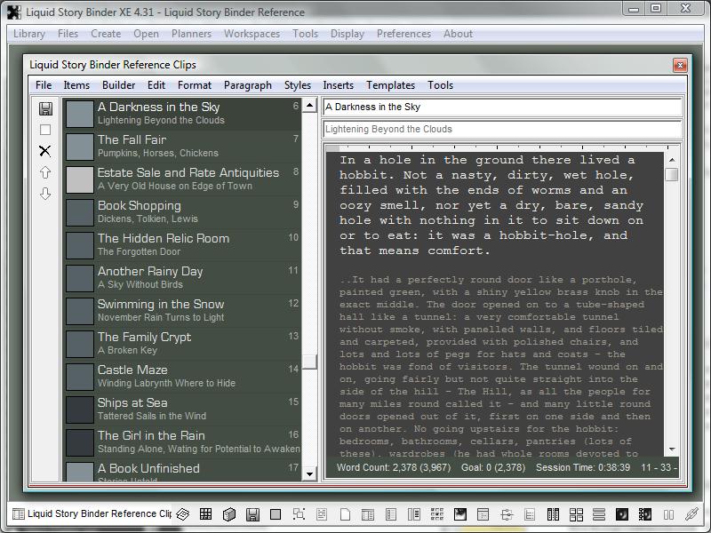 Features  Screenshots Download Liquid Story Binder XE Purchase Liquid Story Binder XE Contact Information Newsgroup Tutorials Affiliate Program Links