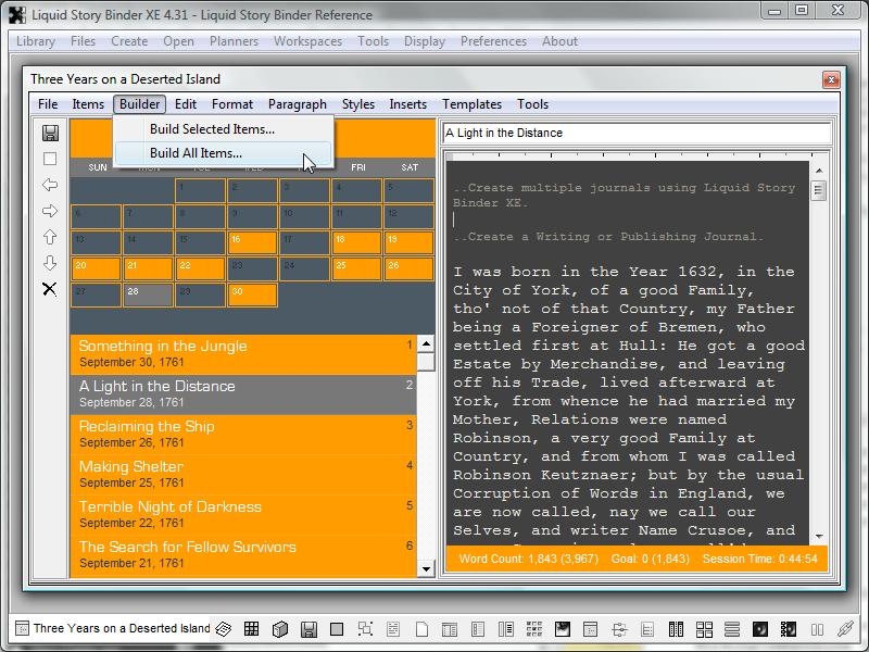 Choose 'Build All Items' to combine your Journal entries into a single Chapter ready for printing or export.