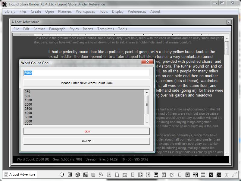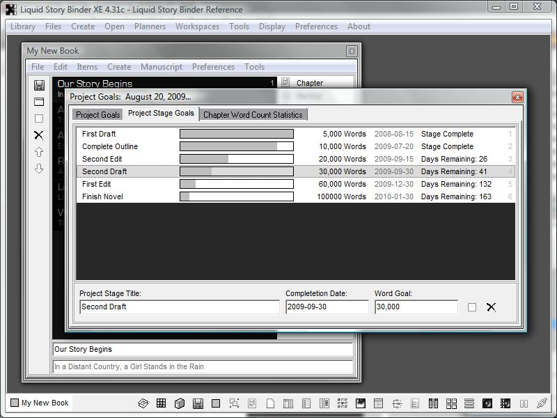 The Liquid Story Binder 'Project Goals' feature allows you to schedule date and word count targets for the currently opened book. Set your start and finish goals and Liquid Story Binder will automatically calculate work days remaining, average word counts, and remaining words left to write.
