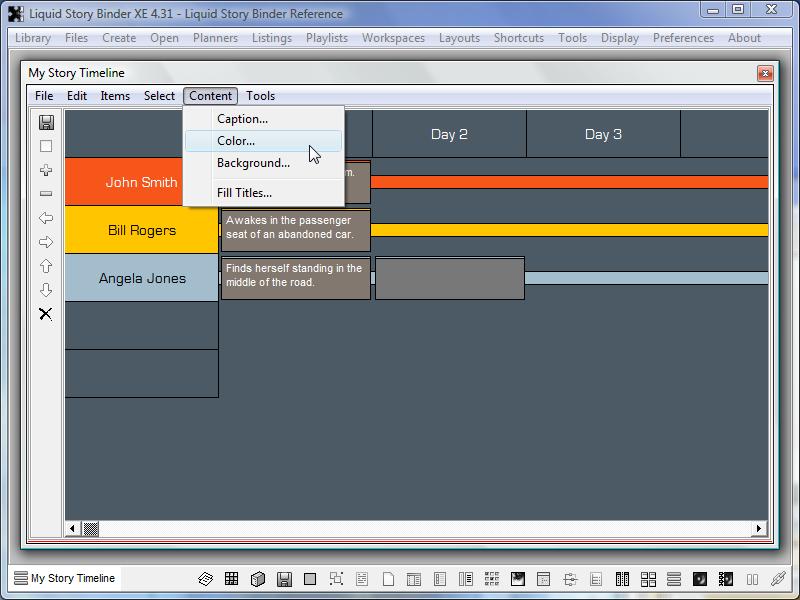 To change a character's timeline color, choose 'Color' from the 'Contents' menu.