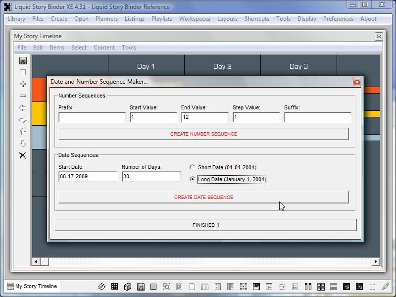 Quickly add sequential date and number information to your Timeline headers. Choose 'Fill Titles' from the 'Content' menu to open the 'Date and Number Sequence Maker' dialog.