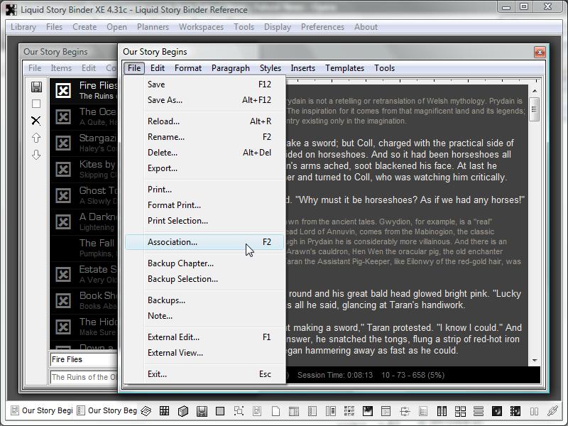 To view the Association dialog from a Chapter, choose 'Association' from the Chapter's 'File' menu. This 'Association' menu option can also be found with Builder, Note, Outline, Checklist, Sequence, Timeline, Storyboard, Gallery, and Dossier windows.